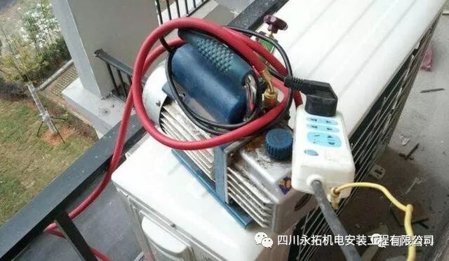 外机安装完毕后在充填冷媒前需要对冷媒管进行抽真空,把管内的空气抽出,保持管内干燥、无水分,否则空气和水会与冷媒混合产生冰晶,严重的会造成设备损坏。