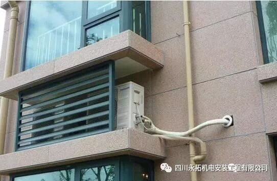 冷凝水管从内机接出后至室外或地漏,至少保持>1%的坡度。质量较高的安装则是从室内机接出后,就近落地,最后会同其他冷凝水管一起接出室外或地漏。严格要求必须在每一套冷凝水管上标准位置安装透气口,避免排水管道没有空气压力,确保排水顺畅。
