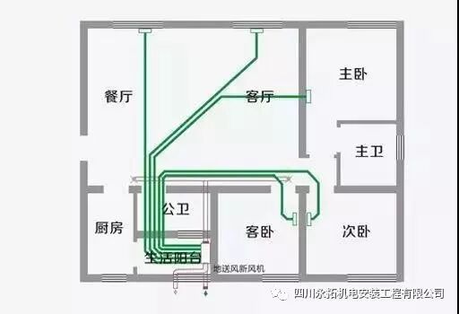 排风口直接与卫生间的竖井或是厨房的烟道连接,导入新风的进风口安装在卧室、客厅的门窗上方。这种送风系统无须送风管道的连接,排风管道一般安装于过道、卫生间等通常有吊顶的地方,基本上不额外占用空间。